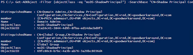 Get-ADObject -Filter {objectClass -eq "msDS-ShadowPrincipal"} -SearchBase "CN=Shadow Principal Configuration,CN=Services,CN=Configuration,DC=red,DC=goodworkaround,DC=com" -Properties member