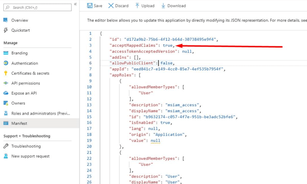 Start by modifying the manifest of the app registration, changing “acceptMappedClaims” to true.