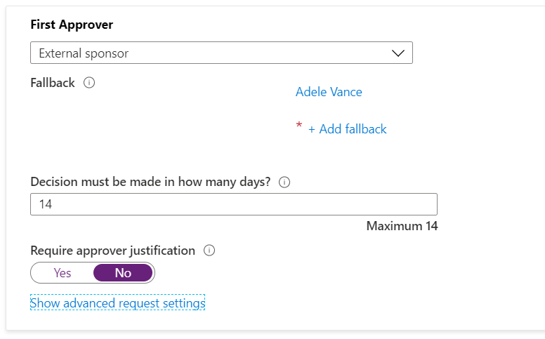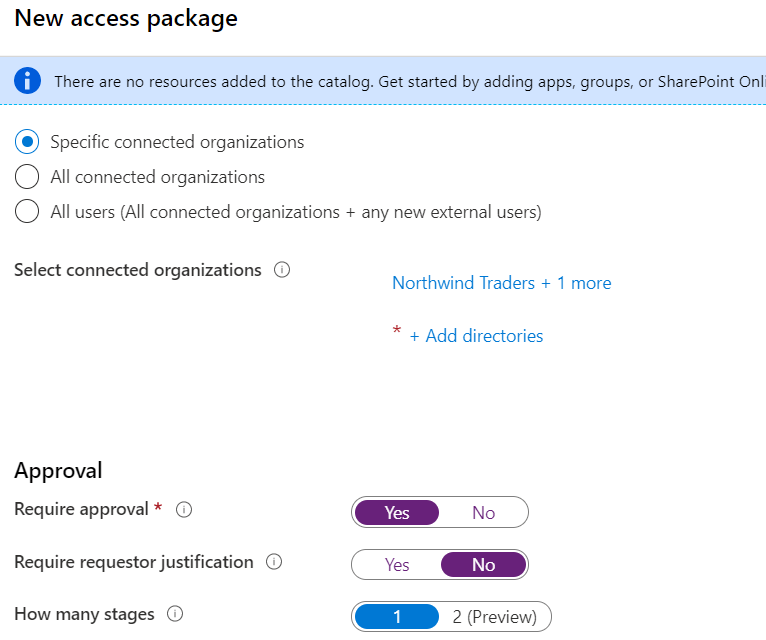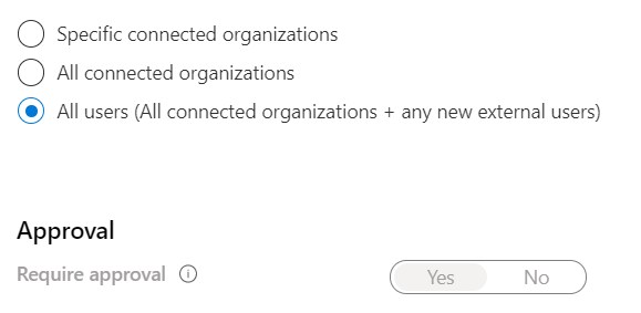- Allowing a defined set of external organizations to request access to an access package, with approval by an external or internal sponsor