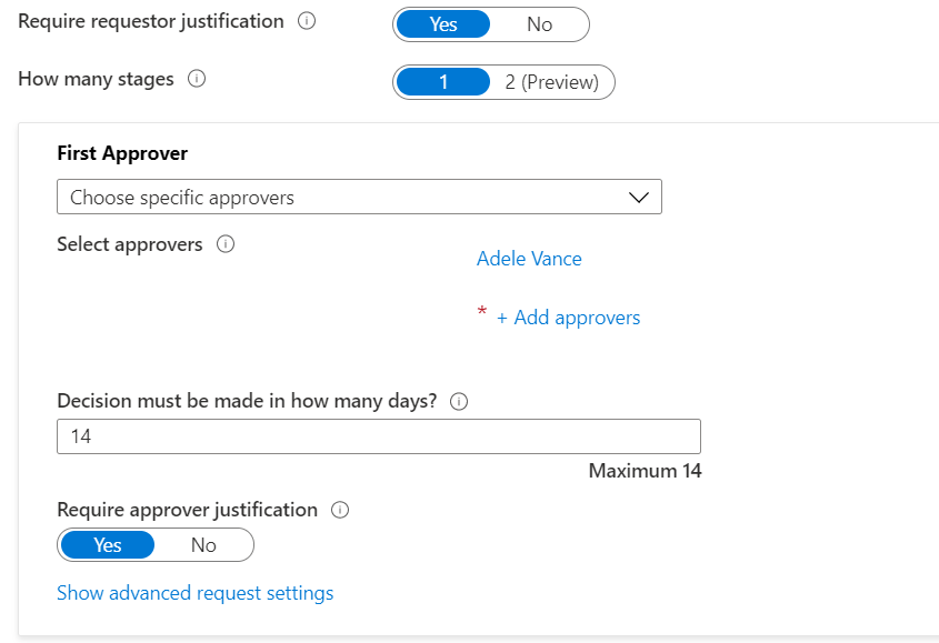 - Allowing a group employees to request access to an access package, with approval by their manager. Example usage: