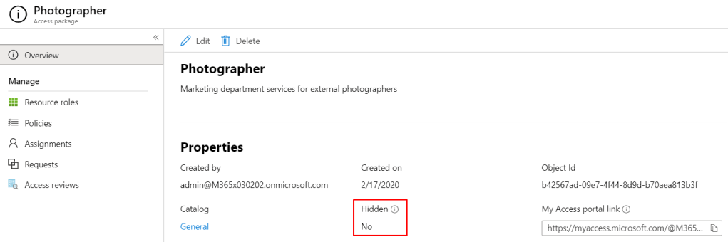 Now, after hiding the package, users will need to know the url https://myaccess.microsoft.com/@M365x030202.onmicrosoft.com#/access-packages/b42567ad-09e7-4f44-8d9d-b70aea813b3f in order to find the access package and request it. Try it out if you want – Adele doesn’t really respond though… 🙂