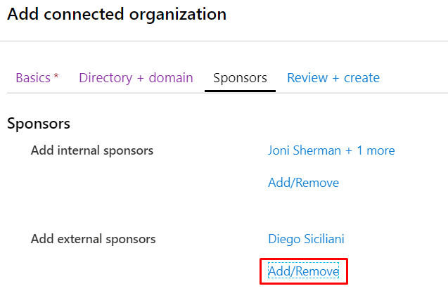 Please note that if you want to add an external sponsor, he must be an existing guest account in your Azure AD (or a regular member account).