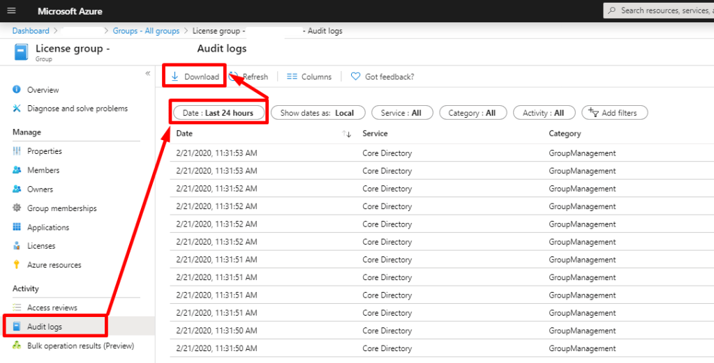 First we found each group in the Azure AD portal and downloaded the audit log in csv format, for the last 24 hours:
