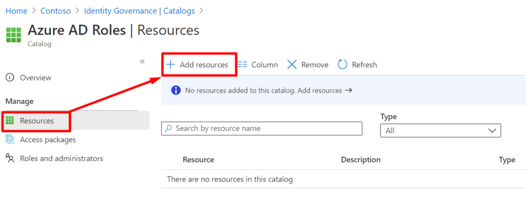 Next, go into the catalog, go to resource and “Add resources”: