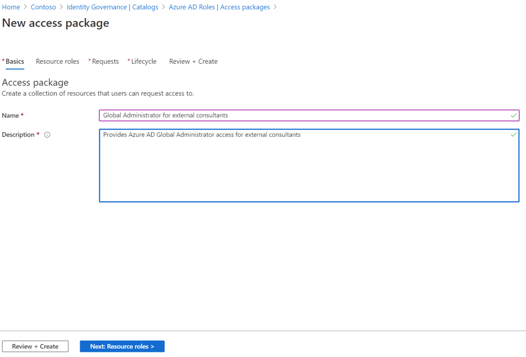 Give some kind of name and description to your access package (I am creating one for external users, granting Global Administrator):