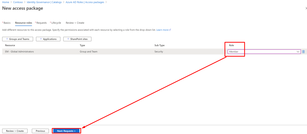 Link the group you added previously to your access package like this, and select “Member” as the role: