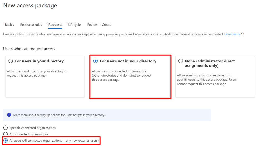 Next, we need to define our policy for who can request. I am creating an access package that anyone in the world can request (but I am going to make it hidden), with approval by a few people: