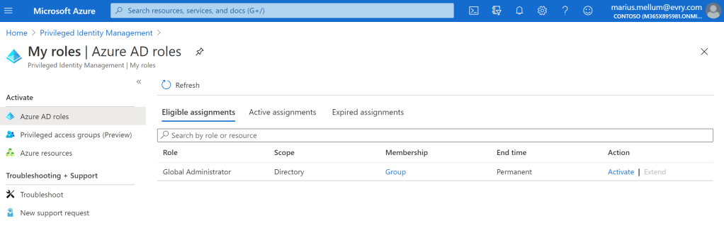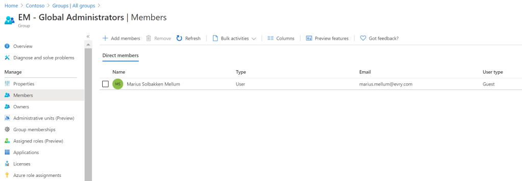 And voila, I am now a member of the “EM – Global Administrators” group, providing the Azure AD role: