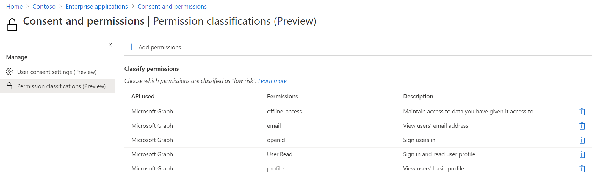 Navigating over to the “Permission classifications” pane, we can define certain permissions that we allow our users to consent to on their own, without administrator involvement.