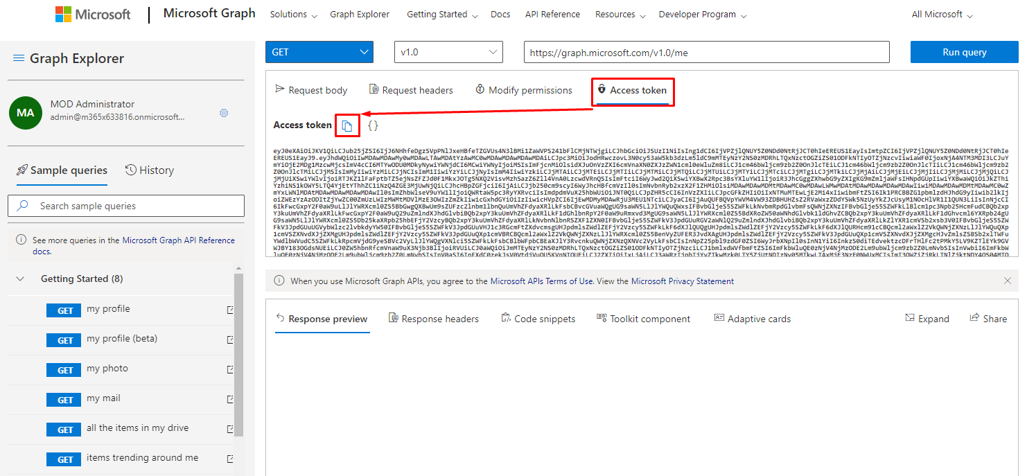 - Copy the access token like this, into the $accessToken variable in the scripts