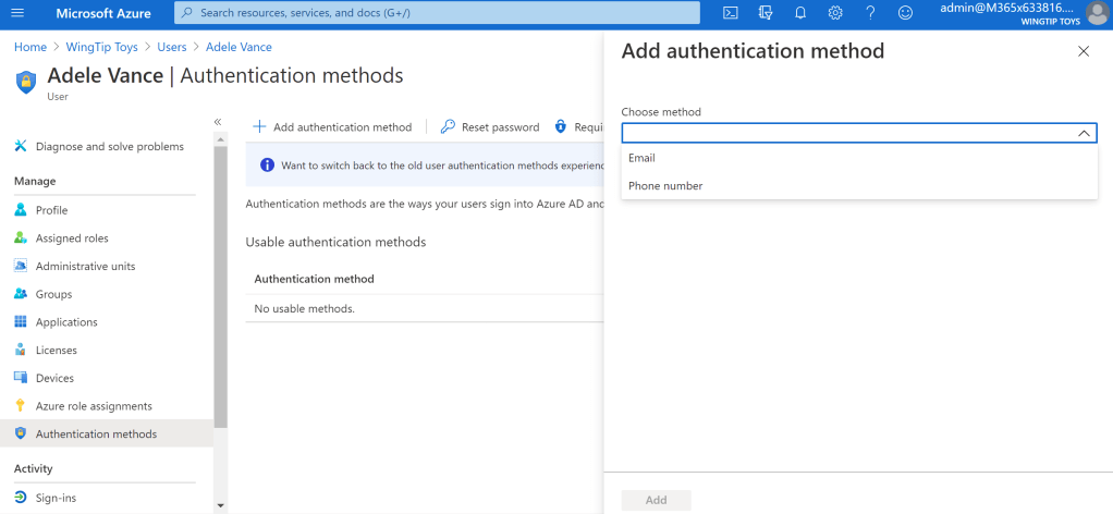 The authentication method is still not listed under authentication methods in the Azure AD portal: