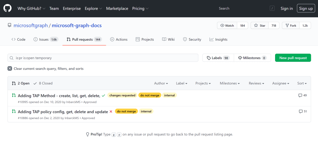 So, apparently the endpoint for Temporary Access Pass is /authentication/temporaryAccessPassMethods under users. Now, how do we create an access pass then? What I usually do is check for pending pull requests on GitHub, and guess what I found?