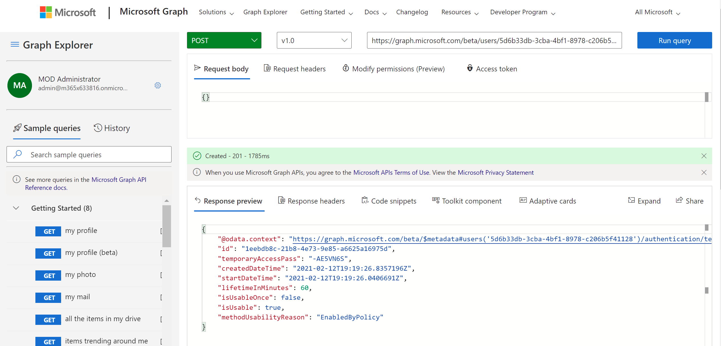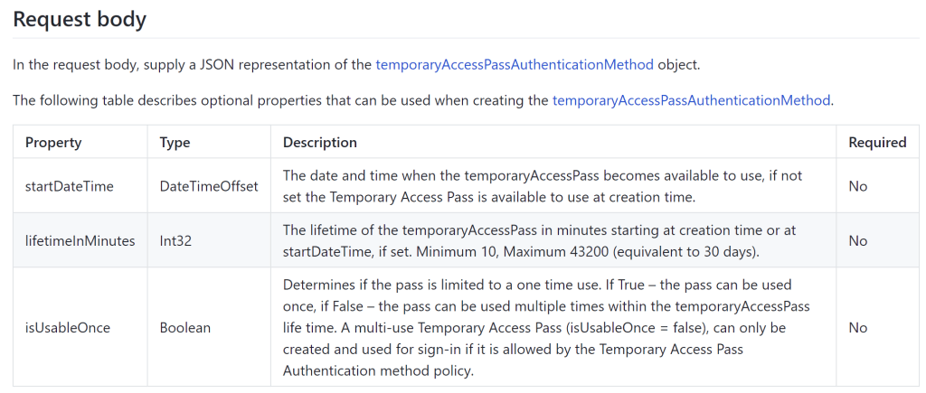 - https://graph.microsoft.com/beta/me/authentication/temporaryAccessPassMethods – VOILA