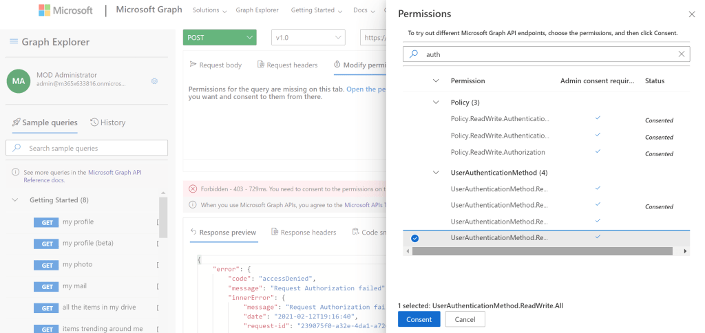 Access Denied. Probably because I was missing the UserAuthenticationMethod.ReadWrite.All consent: