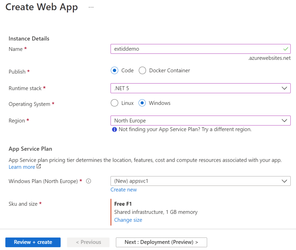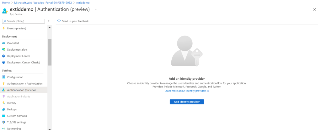 After the web app has been created, we establish authentication by choosing Authentication (Preview) in the left pane, or you can use the non-preview option: