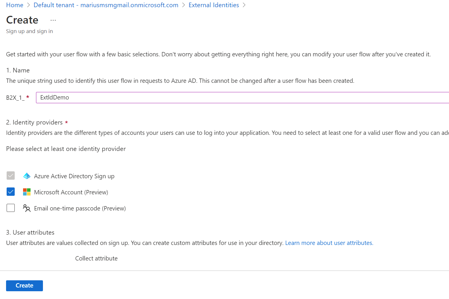 Name the user flow, choose Microsoft Account and Azure Active Directory sign-up – and click create. Enabling email one-time passcode disables Azure AD sign-up, just so you are aware.