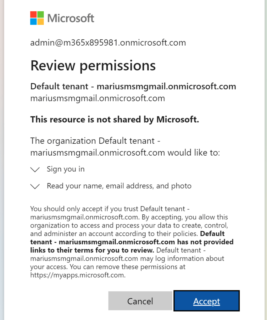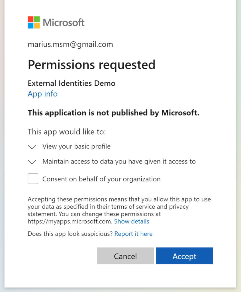 And after that, you’ll receive the regular “B2B consent screen”. Here you should add privacy contact, in order for this page to not display the “has not provided links to their terms” message: