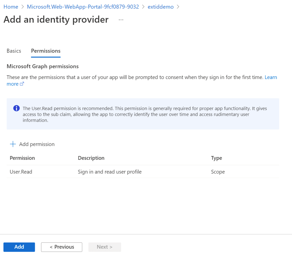 After enabling authentication, we can now go to our web app url https://extiddemo.azurewebsites.net and experience that it now requires authentication, and that the first time someone signs in they must consent to the app. This happens because no one has consented to the application, in the app registration gui yet.