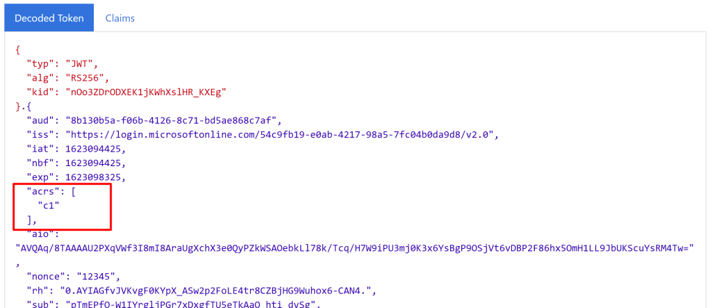 And now we can actually see that the acrs claim has been populated with “c1”, our “High security operation” authentication context: