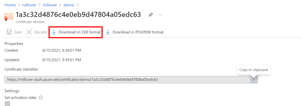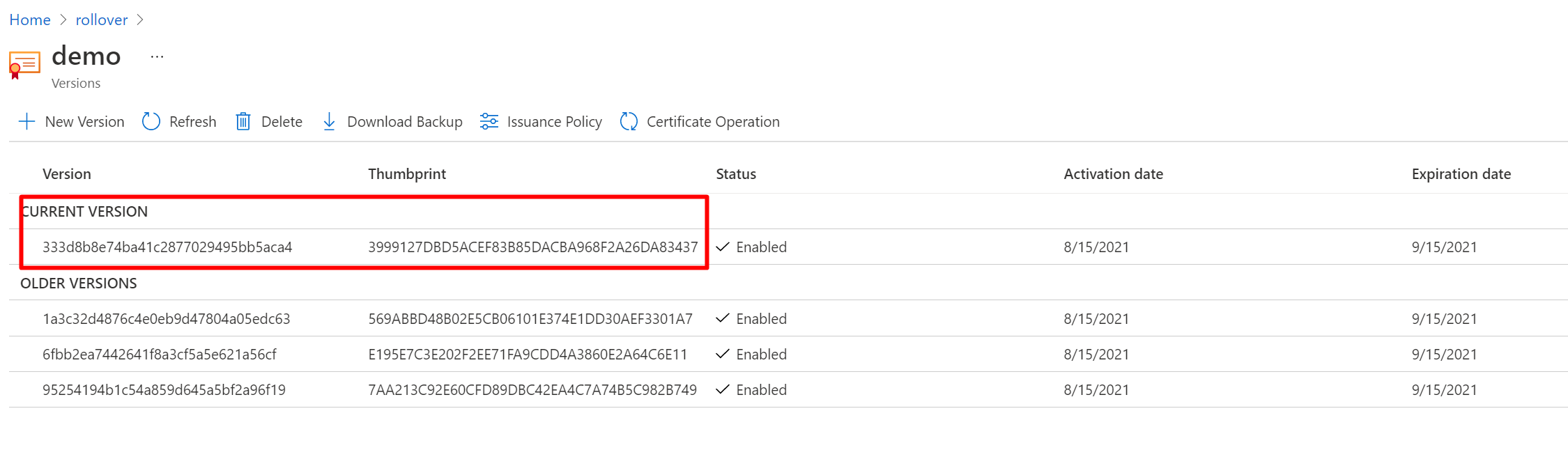 We should now see a new certificate version in KeyVault: