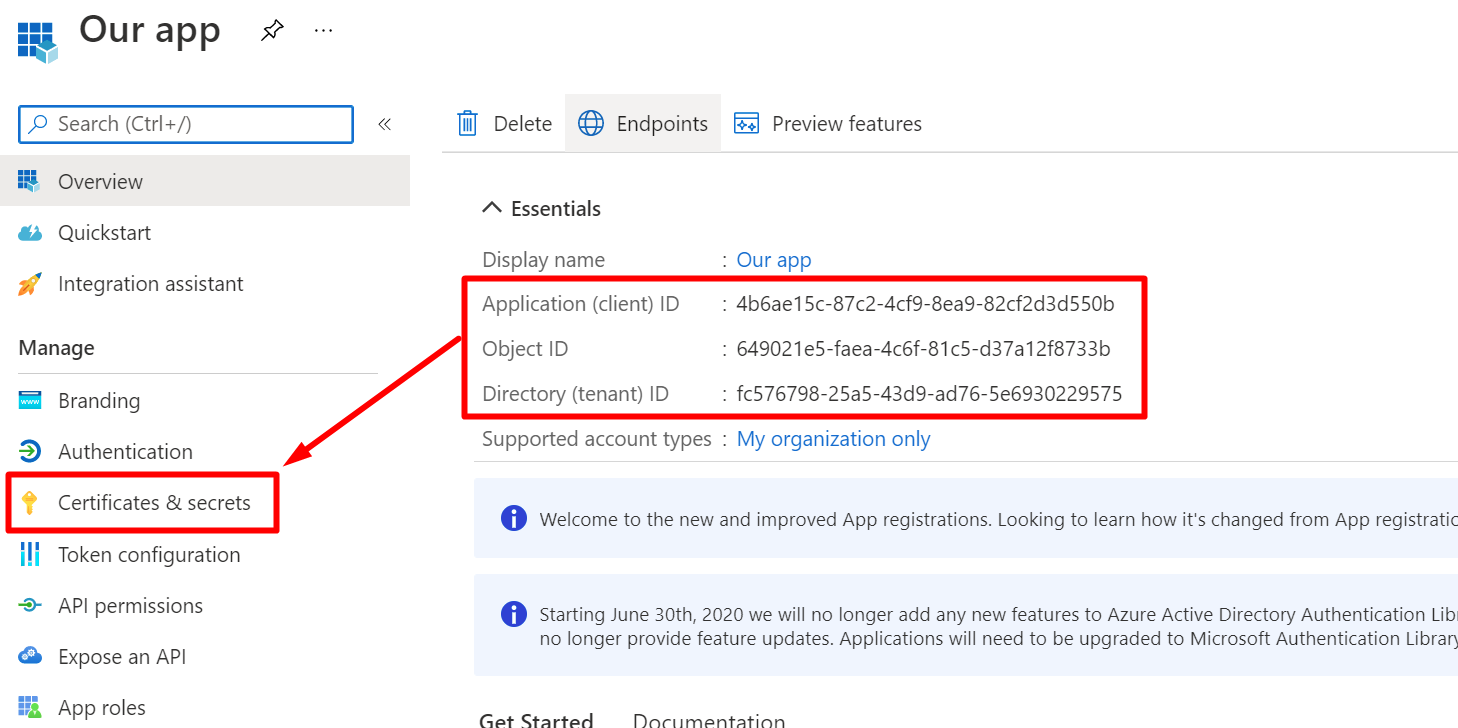 Note down the app id, object id and tenant id of the app registration. You will need all of them for our next steps.