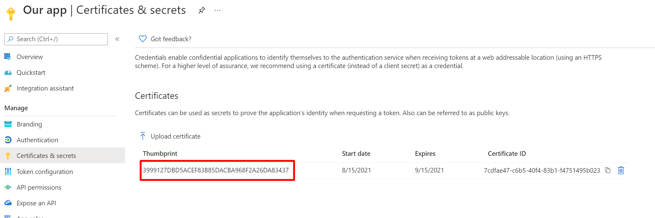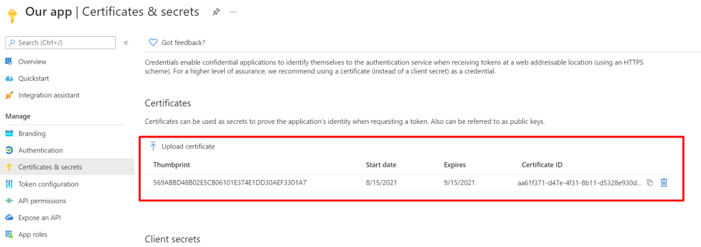 And we should see the same certificate uploaded to our app registration: