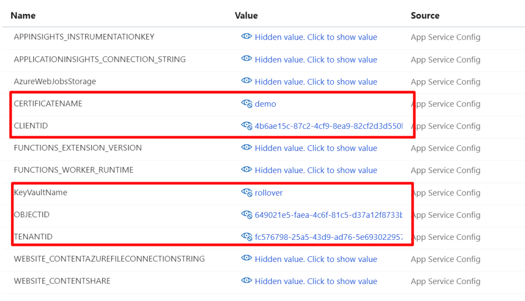 Go to the Azure Function App again, and find “Configuration” in the left menu. Use the “New application setting” button as below, to create the settings “TENANTID”, “CLIENTID”, “OBJECTID”, “KeyVaultName”, “CERTIFICATENAME”: