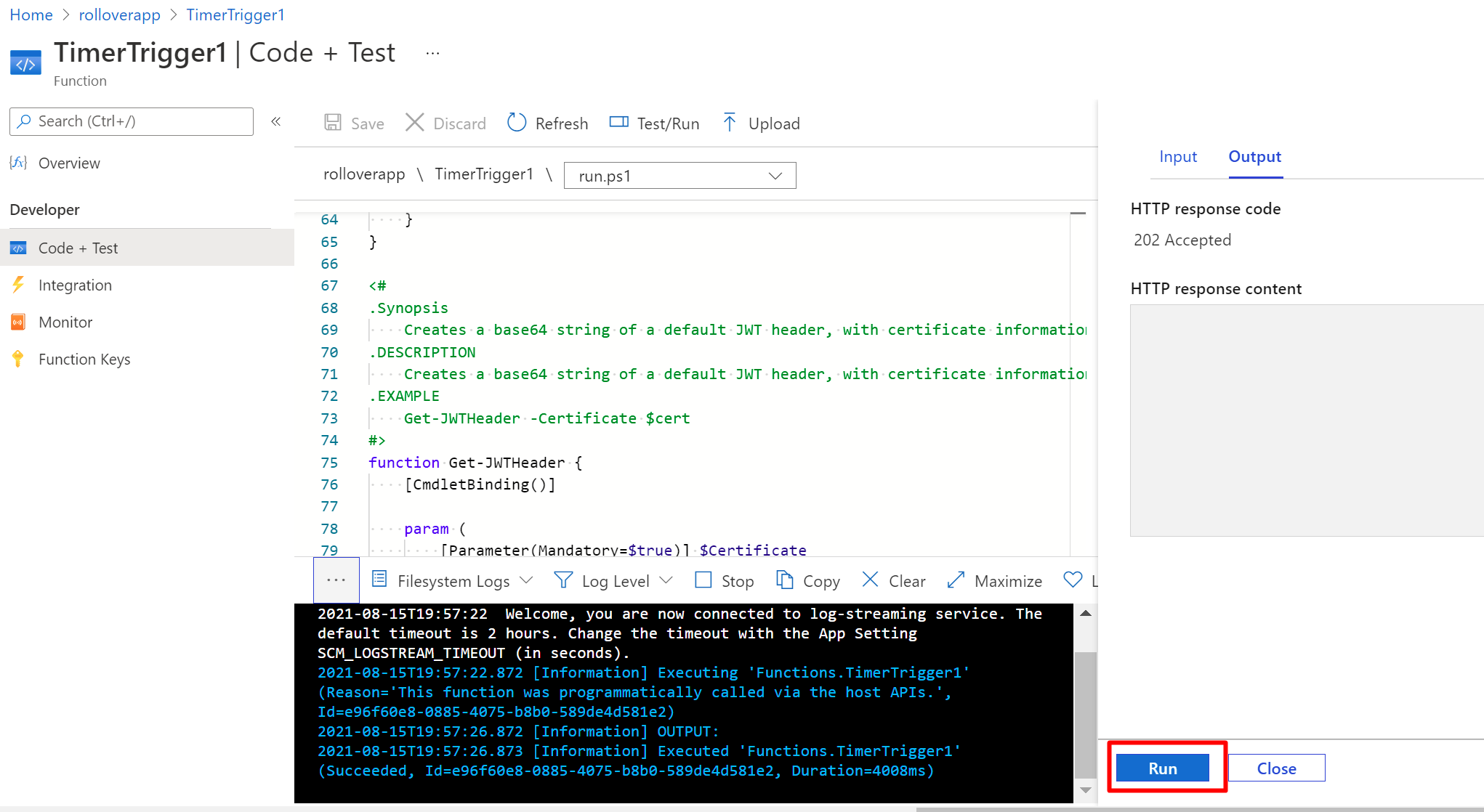 After saving, we can manually trigger the function: