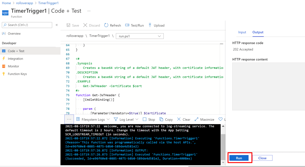 First of all, let’s see how this works. The API endpoint we use is https://graph.microsoft.com/v1.0/applications/{id}/addKey, with “id” being the objectid of the application registration (not the clientid). This endpoint requires a bearer token, which should be gotten using client credentials with JWT signed by a certificate. Code shown in the Azure Function code provided.