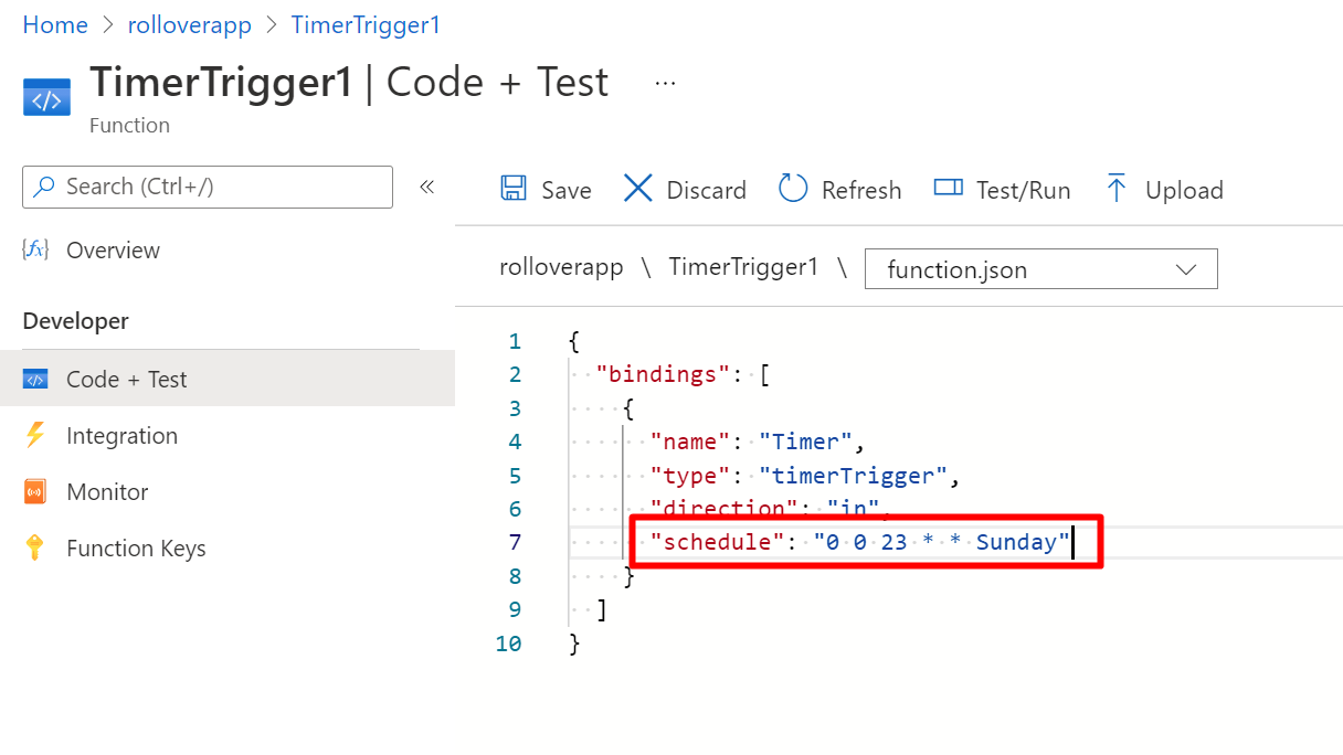 Cool? Now, by default Azure Function timer trigger is triggered every 5 minutes. This is way too often, so let’s change it to weekly: