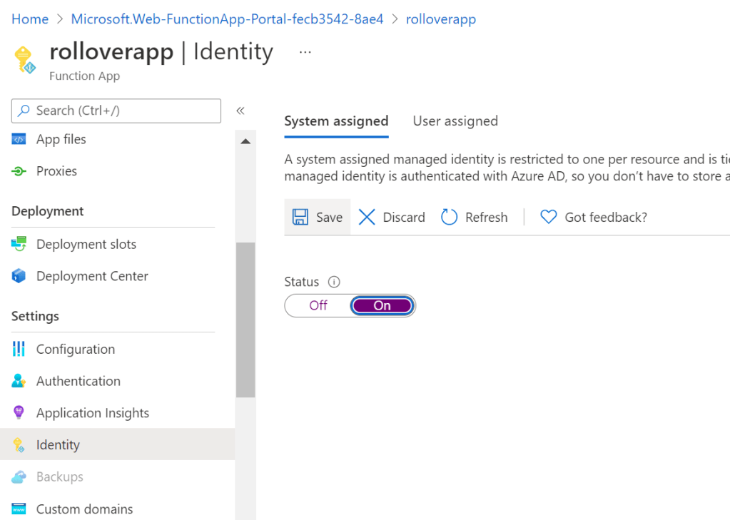 Wait a little bit for Azure to deploy your function app, and go into the resource. Find “Identity” in the left menu, and enable System Assigned Identity: