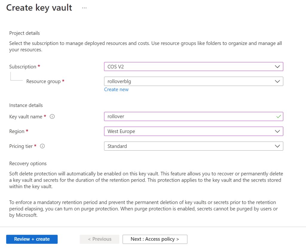 Continue to create a Key Vault:
