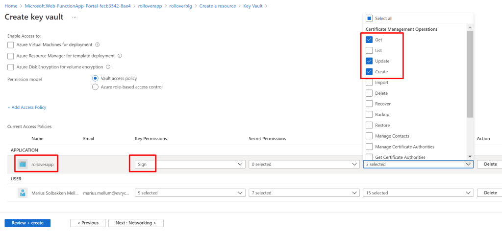 During the creation wizard, add the rolloverapp identity with Key (Sign) and Certificate (Get, Update, Create) permissions.