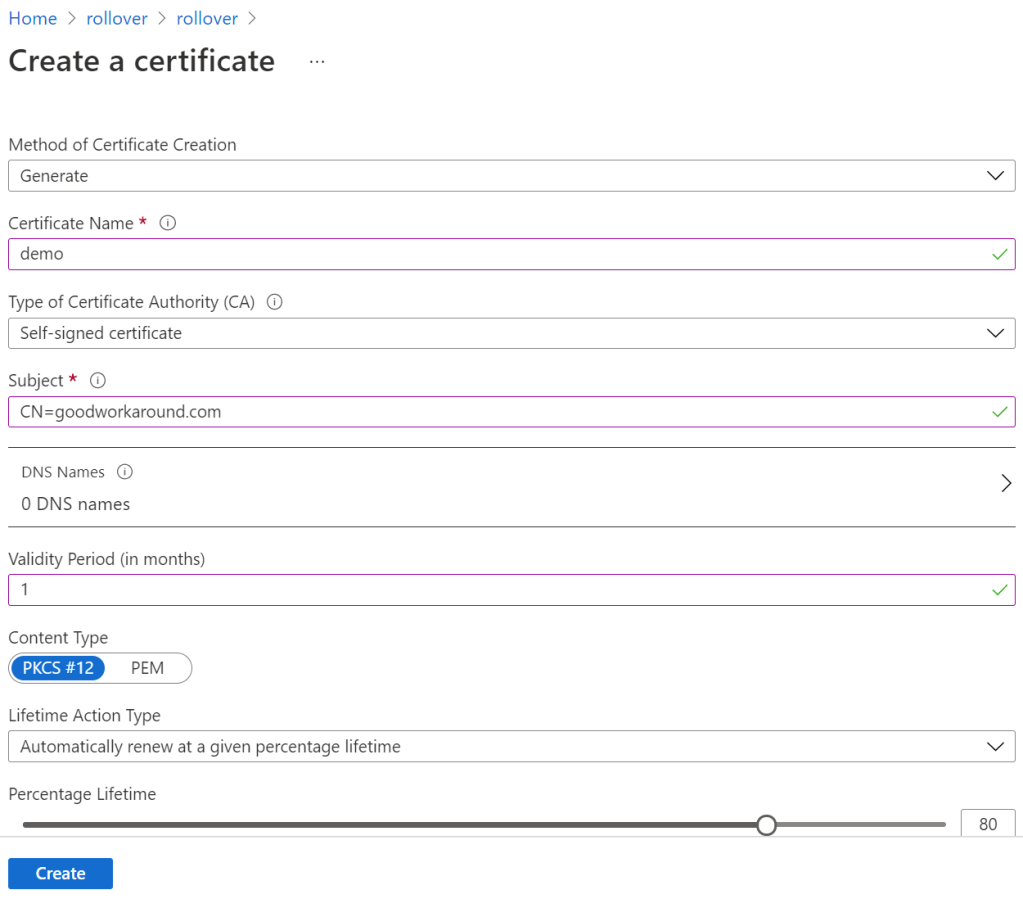 After creating the Key Vault, create a certificate: