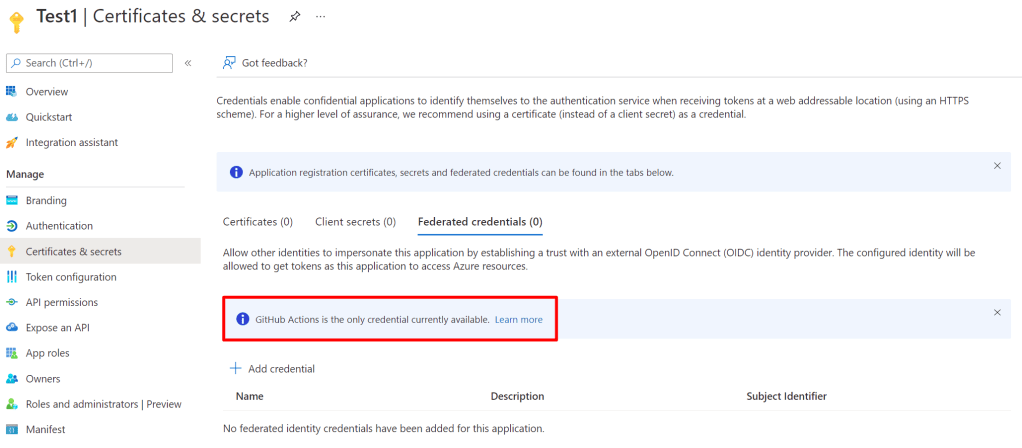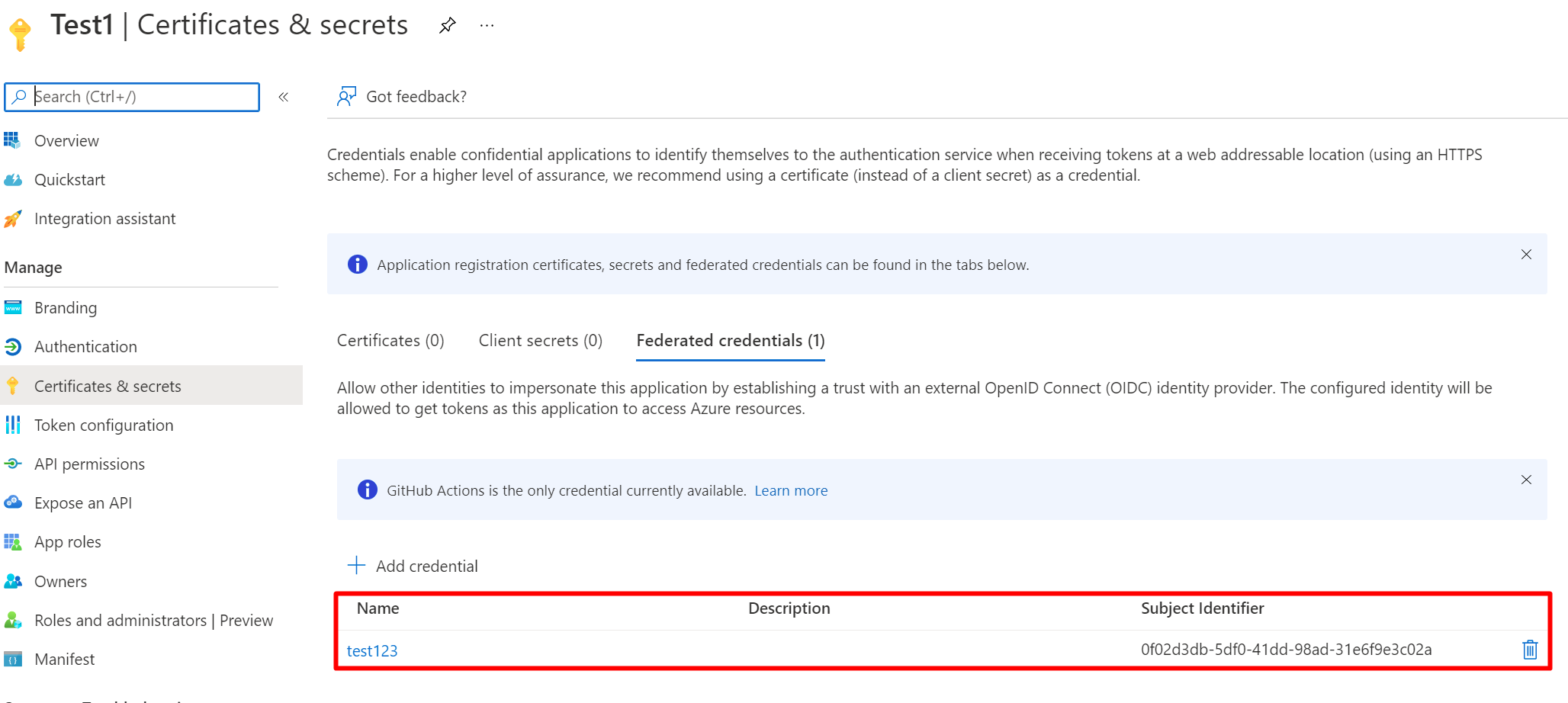 There we go, after adding some more parameters, we have successfully added a federated identity credential to our app: