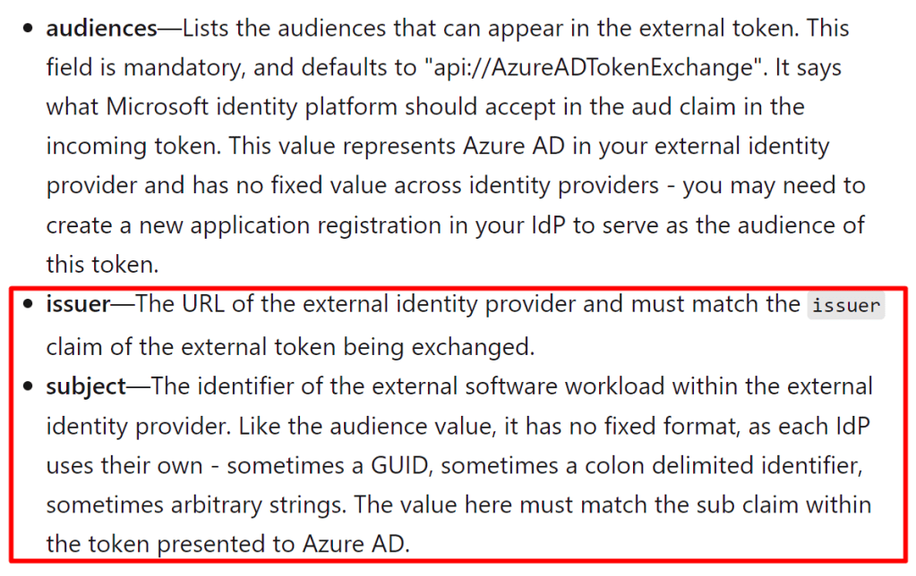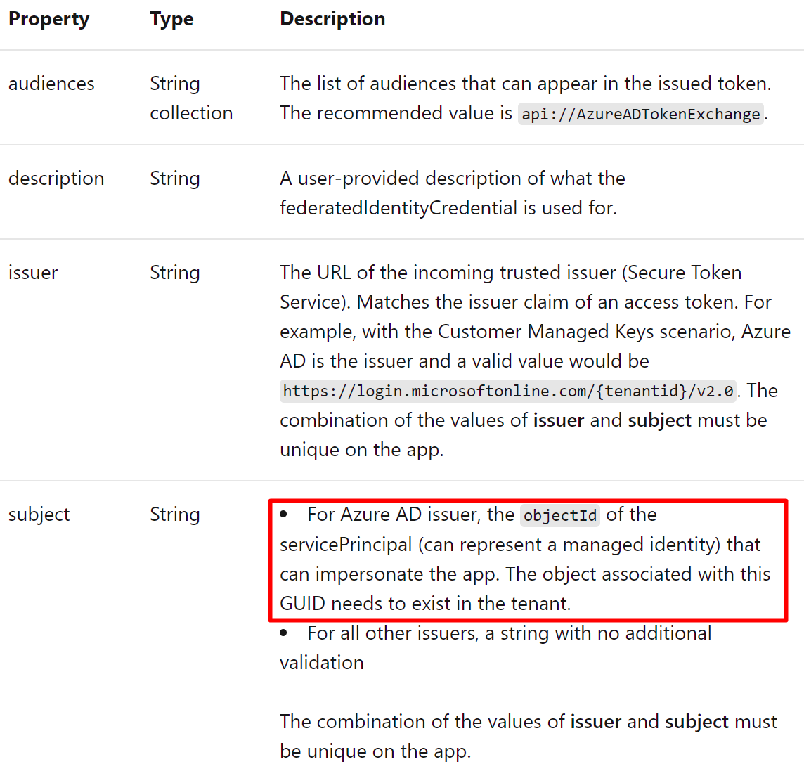Looking at this documentation shows us that we should only need to set issuer and subject in a federatedIdentityCredential object: