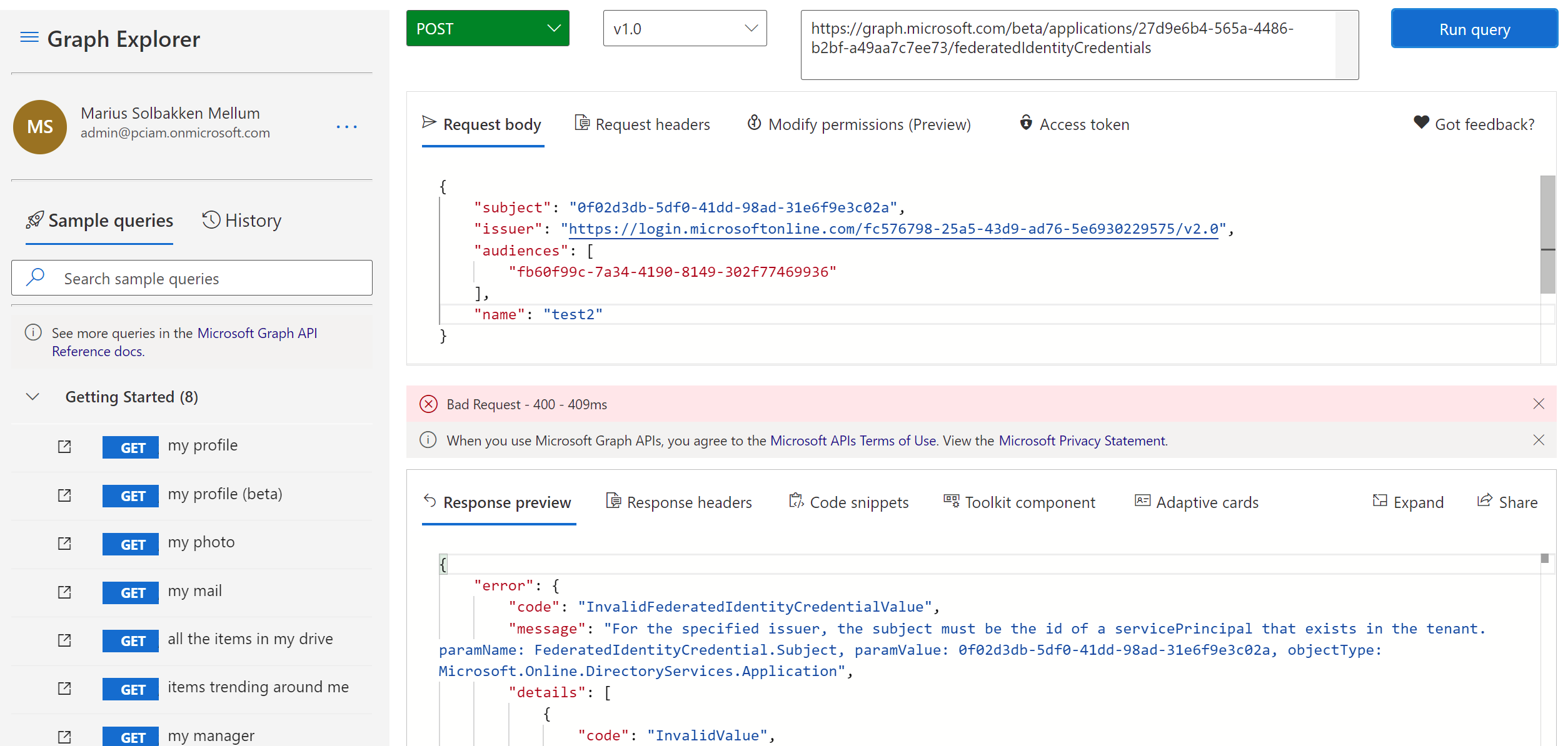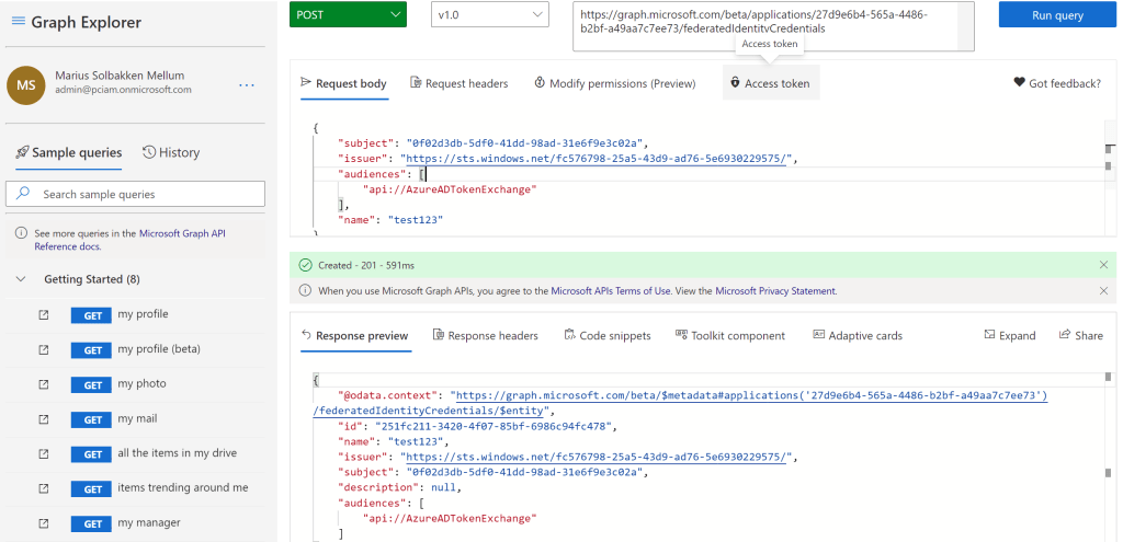 I don’t yet know whether the issuer is correct though, but we can now try things! We set the audience to api://AzureADTokenExchange, so I guess that is the resource we need to request: