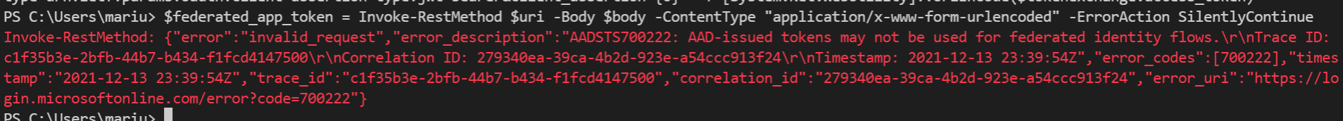 AADSTS700222: AAD-issued tokens may not be used for federated identity flows.