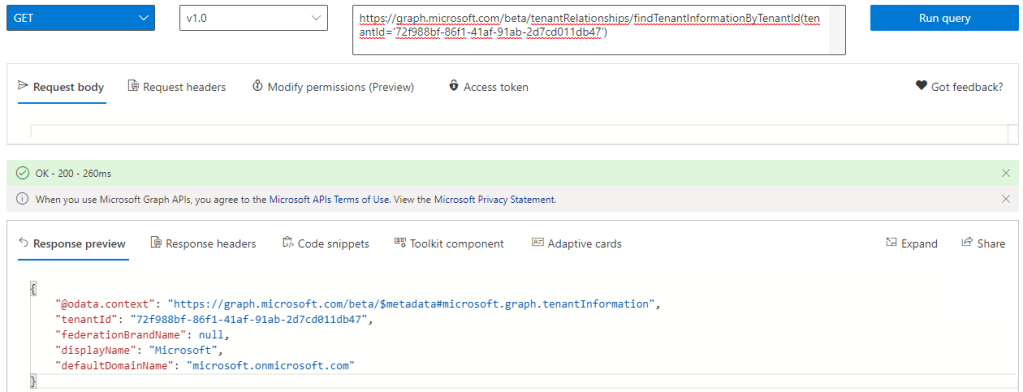 GET https://graph.microsoft.com/beta/tenantRelationships/findTenantInformationByTenantId(tenantId='72f988bf-86f1-41af-91ab-2d7cd011db47a')
