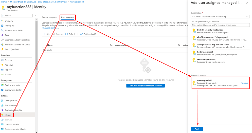 Click on Identity, choose User assigned, find your user assigned identity and click Add.