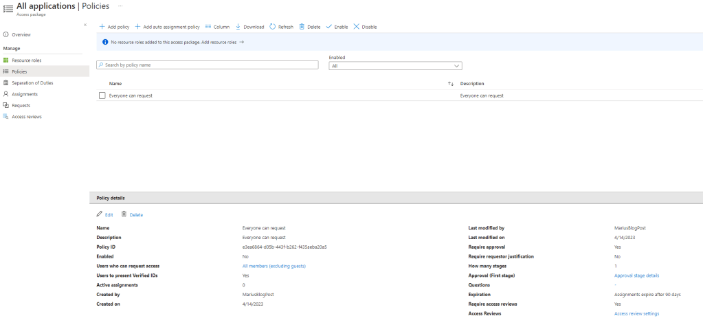 Now, the last thing remaining is to create a policy for one of our access packages:
