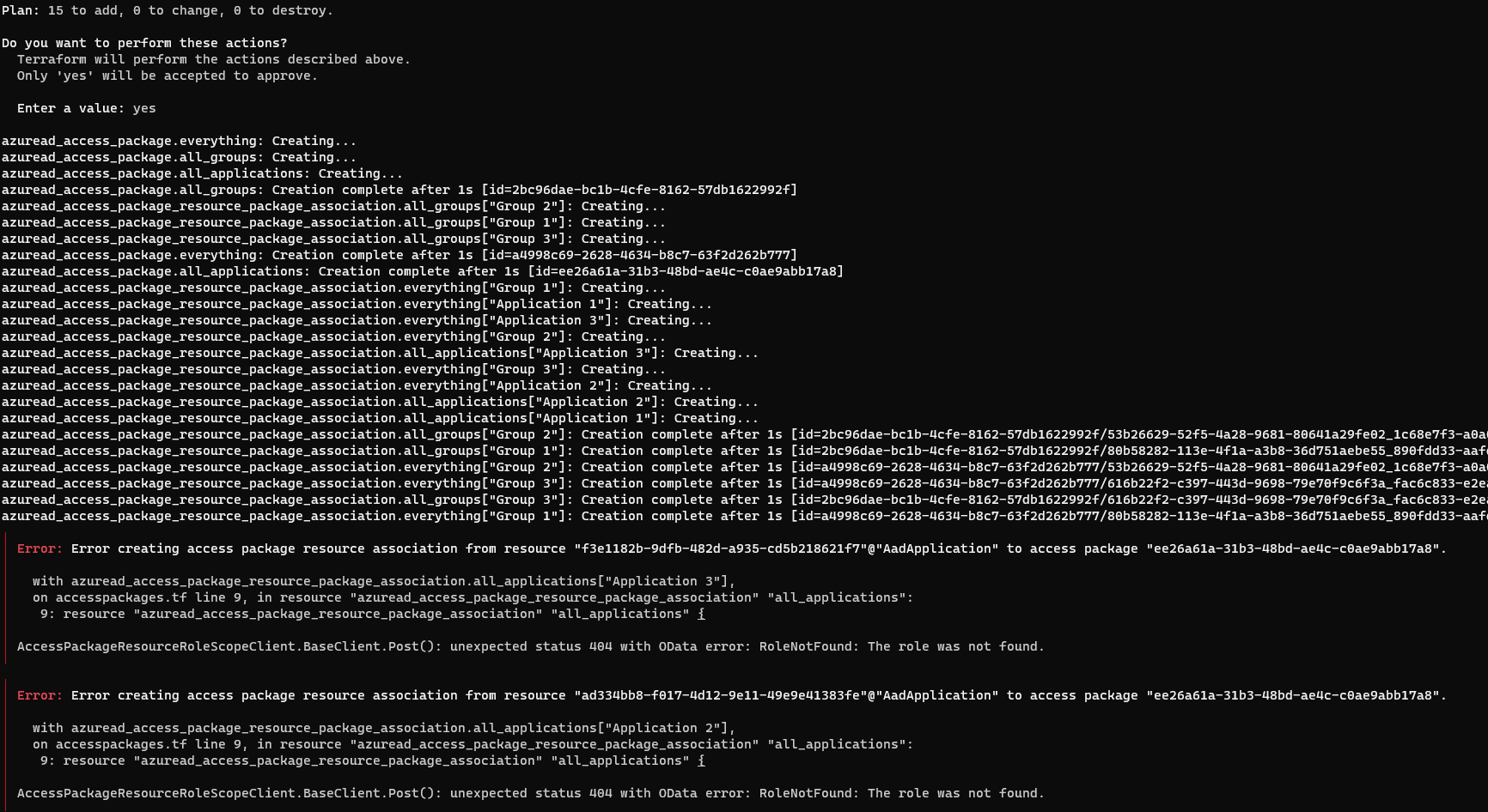 3. It’s 11/5/24 and Terraform still doesn’t appear to support associated Applications with Access Packages. Did you ever find a suitable workaround? Your issue on GitHub (#1066) never appears to have been assigned.