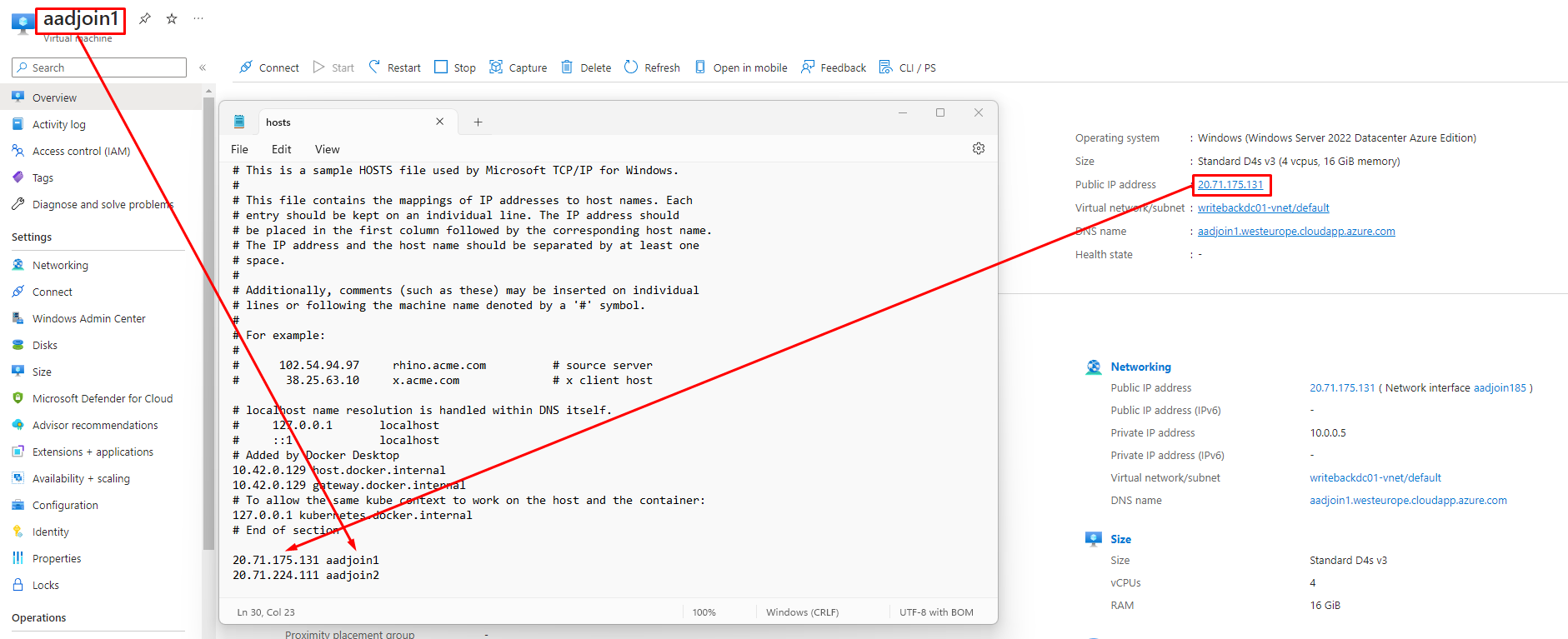 Second, we will copy the IP-address of the virtual machine, adding it to our hosts file (because I am lazy, and I have not configured a DNS suffix for my computer):