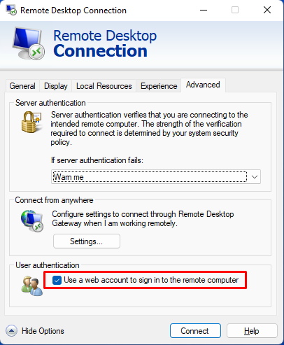 2. Go to Advanced and enable Use a web account to sign in to the remote computer
