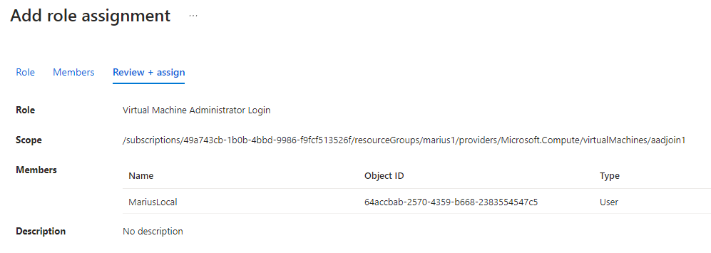 Third, we must assign our user (named MariusLocal) the Azure RBAC role Virtual Machine Administrator Login: