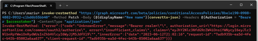 Using the access token before the step up authentication in another tool, such as PowerShell, shows us what happens error message wise: