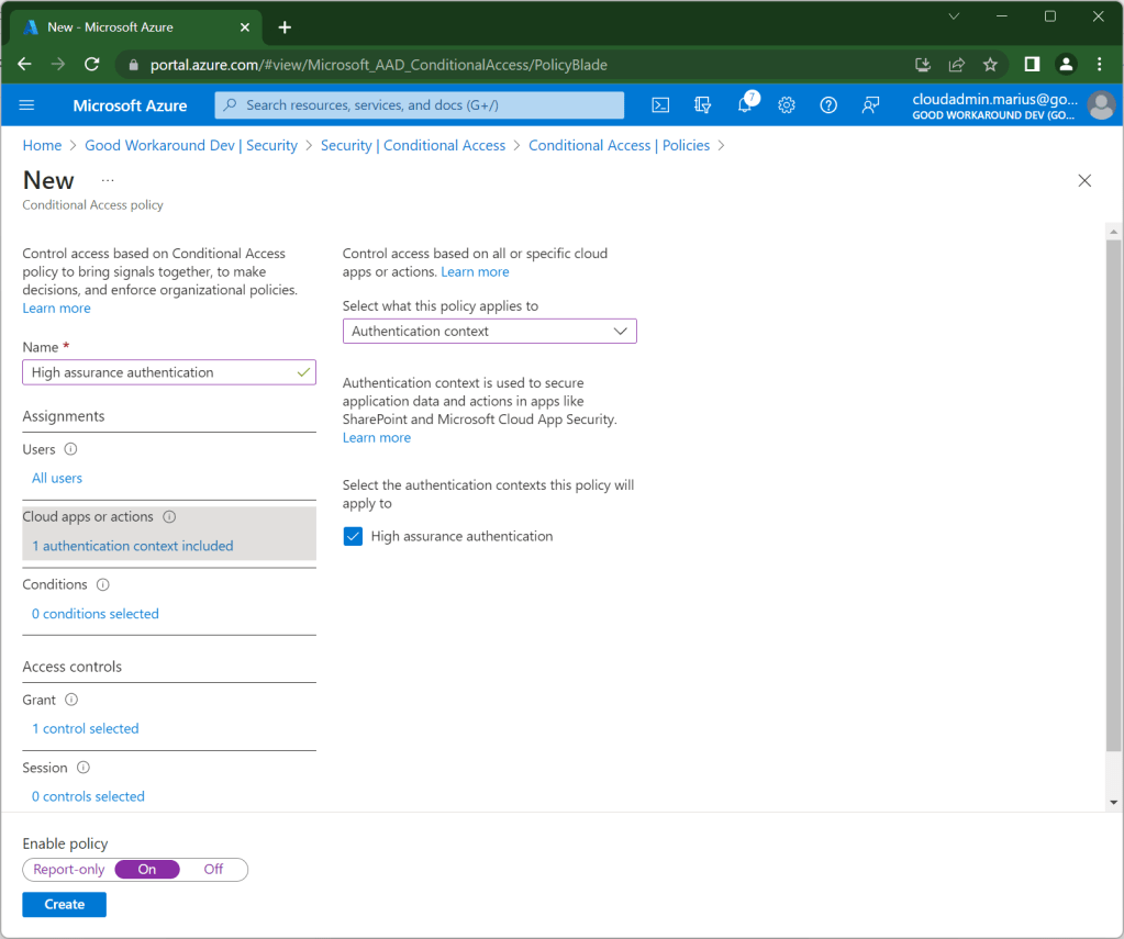 - Created an authentication context c1, named High assurance authentication. Just FYI, this is just a name, and you can name it whatever you’d like.