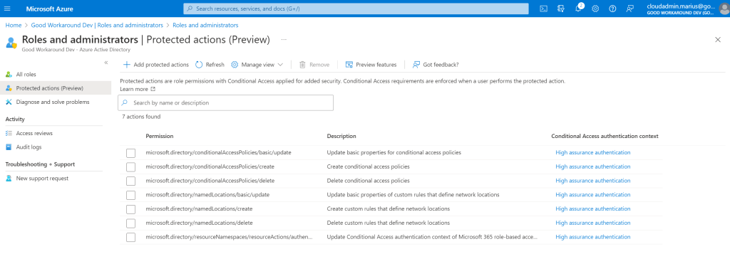 Under the Roles and administrators pane in Azure AD, we can now find Protected actions: