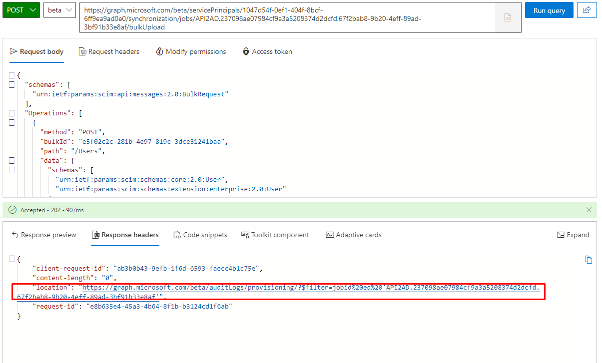 https://graph.microsoft.com/beta/servicePrincipals/1047d54f-0ef1-404f-8bcf-6ff9ea9ad0e0/synchronization/jobs/API2AD.237098ae07984cf9a3a5208374d2dcfd.67f2bab8-9b20-4eff-89ad-3bf91b33e8af/bulkUpload