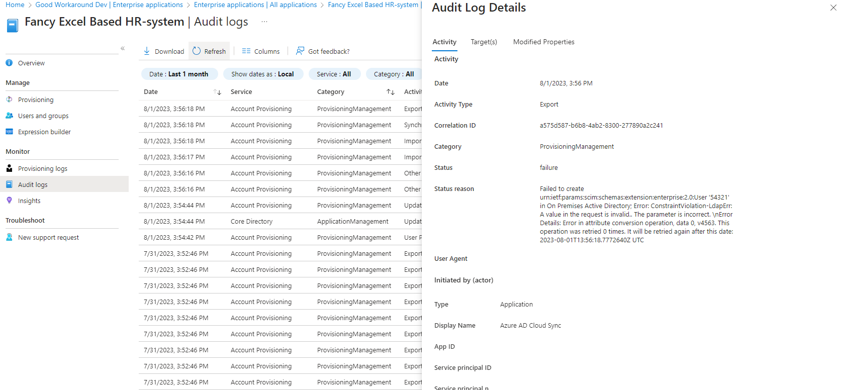 This requires the AuditLog.Read.All permission. We can check the provisioning log in the UI, where we now find an error: